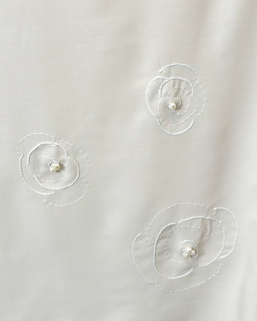 The A-line silhouette glides with your steps, crafted double-lined from lightweight fabric that feels like air against your skin. Hand-embroidered flowers with pearls around to elevate the skirt.